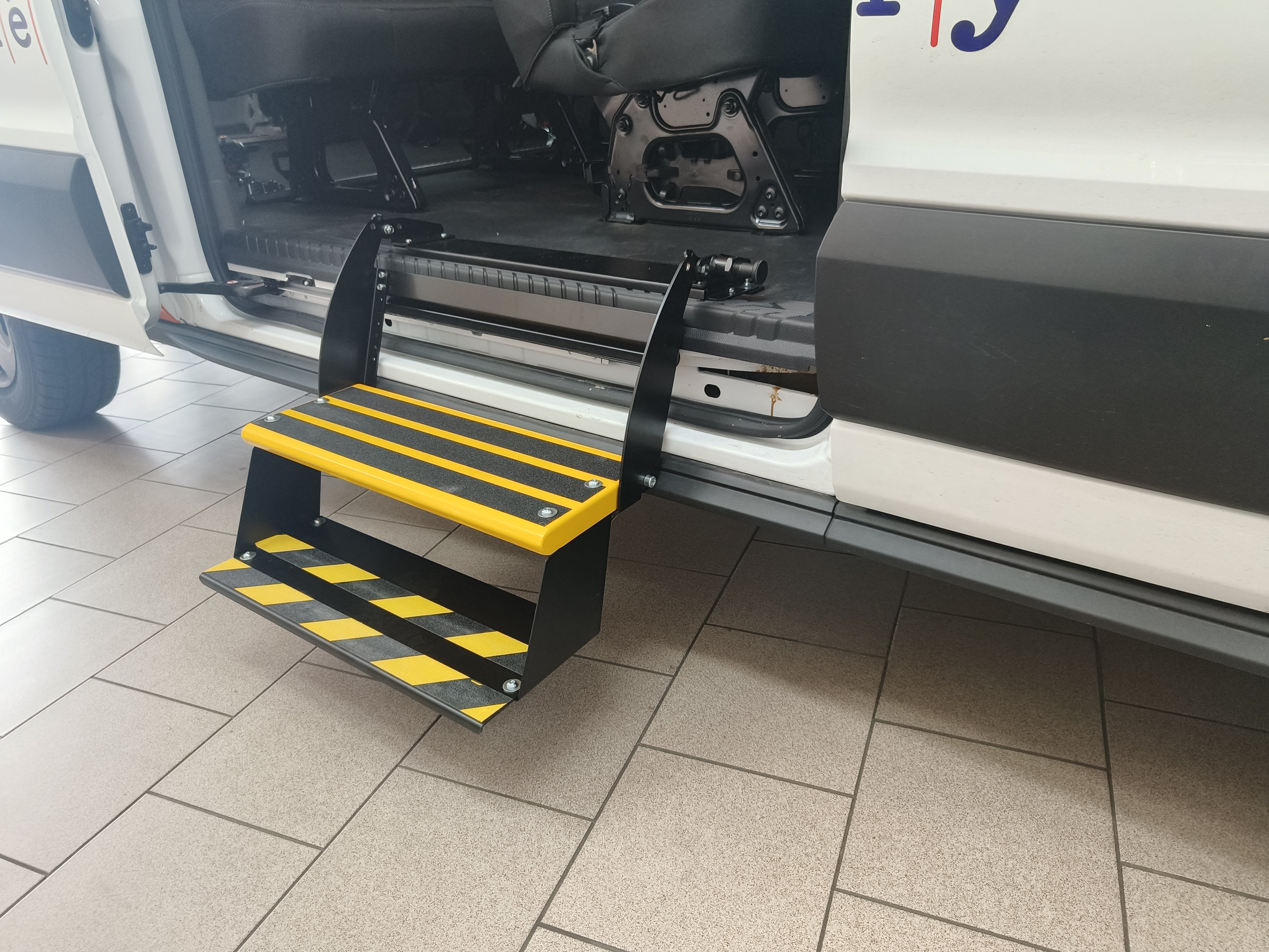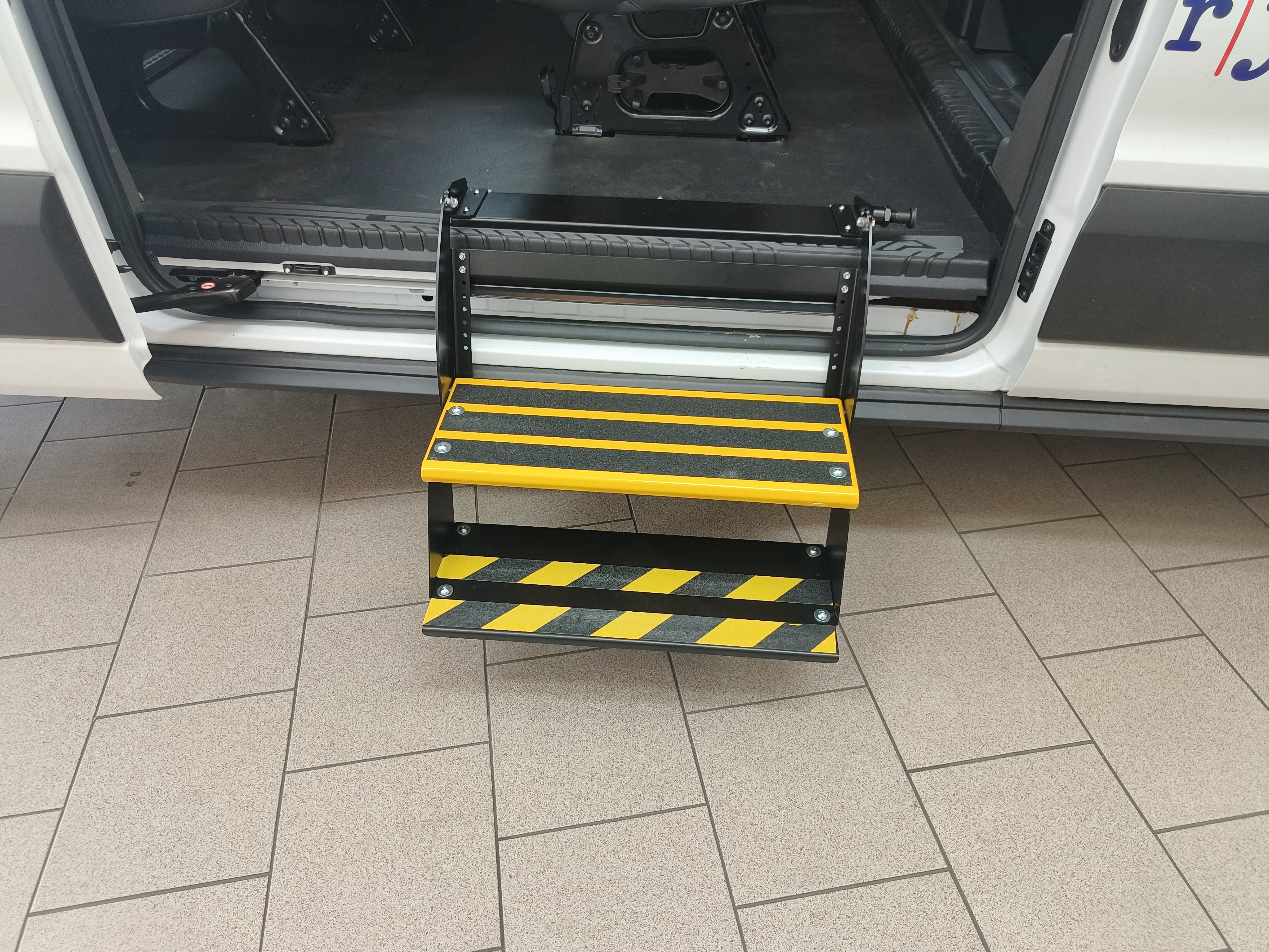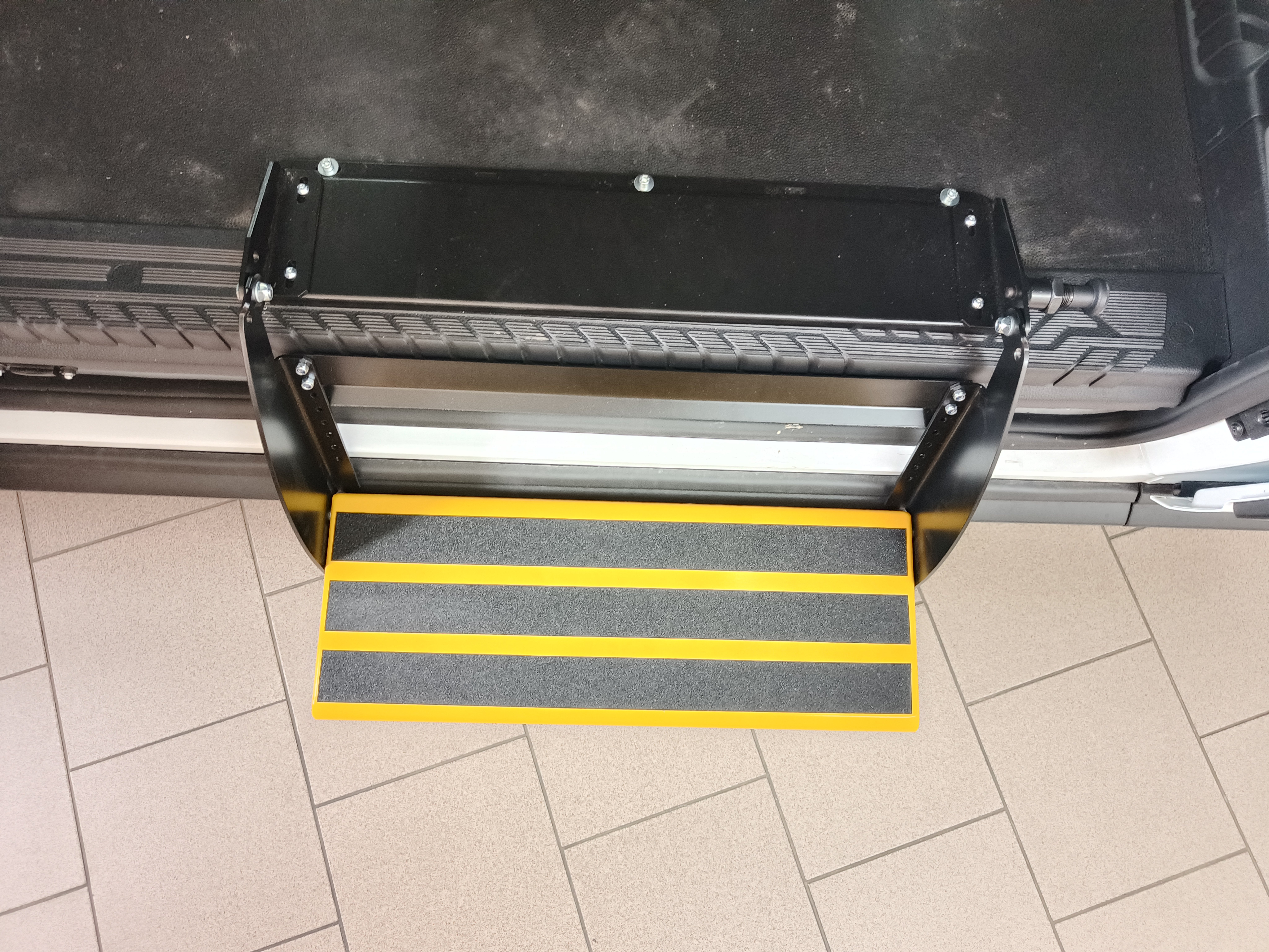 Die zusätzliche Einstiegstufe wird vor allem bei Lieferfahrzeugen zum einfacheren Einsteigen in den Fahrgastraum in die zweite bzw. dritte Sitzreihe und danach zum Aussteigen verwendet. Die Stufe können wir klappbar, nach Maß des konkreten Fahrzeugs fertigen. Man kann auch Serienprodukte – ausfahrbare Stufen - einsetzen. Es kommt darauf an, wie die Anforderungen des Kunden sind und was die Fahrzeugkonstruktion ermöglicht.